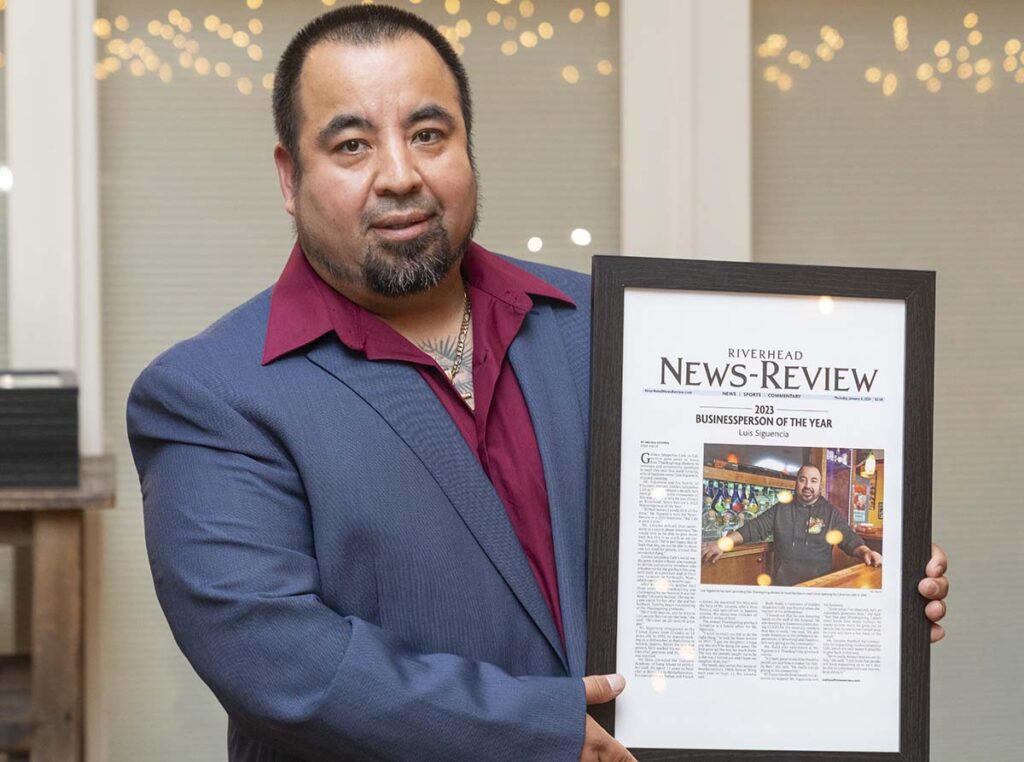 Luis Siguencia, owner of Golden Jalapeños Café in Calverton, was honored as 2023’s Business Person of the Year for his years of giving back to veterans and those in need within the community. Since opening Golden Jalapeños in 2014, Mr. Siguencia has offered free Thanksgiving meals to families in need. “He’ll help anyone, and he tries to hire people that can use the help,” one friend and fellow volunteer said.