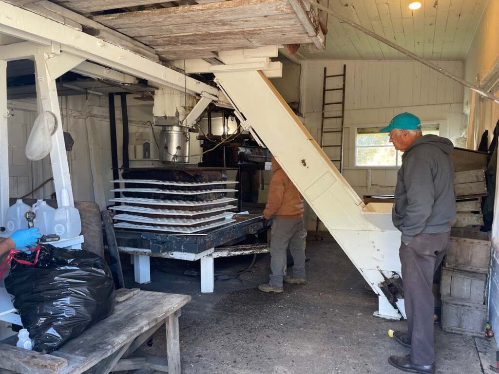 Another way of selling the surplus is to convert the apples to cider. On the day a visitor toured the farm, workers in another barn were processing apples and filling jugs with cider. The cider press on the farm dates to about 1907 and remains in use every fall.
