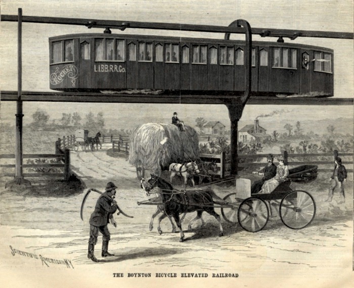 This experimental railroad was based on a diesel-powered bicycle train that Eben Boynton had run for two years from Brooklyn to Coney Island. These double-decker cars were able to accommodate 200 passengers per trip. The Long Island version was much smaller, with a single level, trolley-shaped car that only carried 24 people at a time. Construction of the first two miles was completed in 1894.