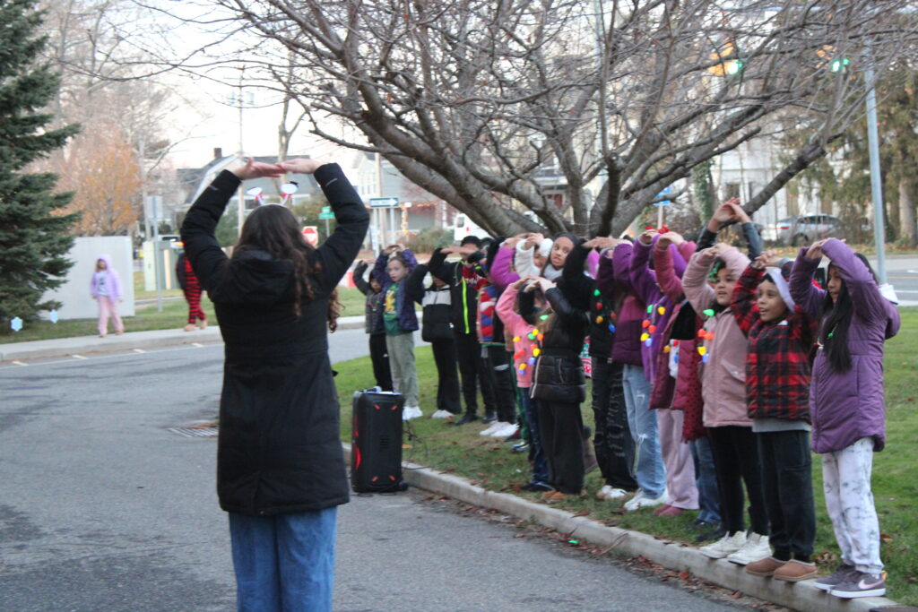The school’s fourth-grade singers showed off their voices, belting out three holiday tunes, led by Lily Kutner, the school’s music teacher. Following the special concert, parents joined their kids and looked up to the window above the main entrance, counting down from 10. At the end of the countdown, the window was illuminated by the school’s giant wreath, lit up with multicolored lights.