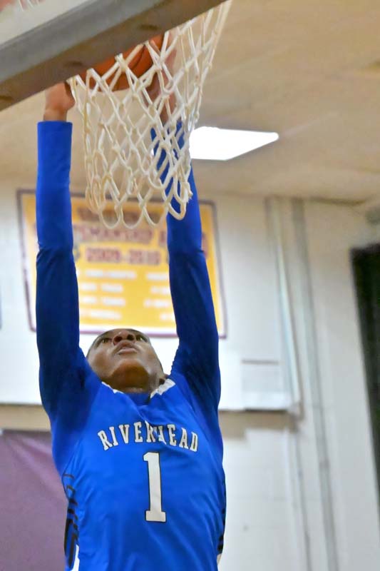 Riverhead got contributions up and down the lineup including a star-studded performance from their sophomore point guard Anaiis Mitchell, who collected 13 assists and scored 16 – including a rim-rattling dunk off a fast break.
