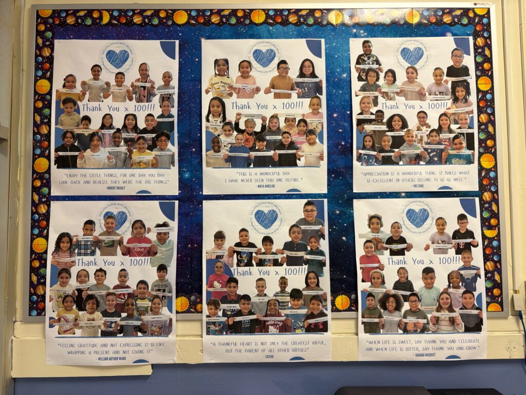 Principal Thomas Payton and Assistant Principal Gary Karlson also turned one of the school bulletin boards into a display of gratitude towards staff expressed in 100 different languages.