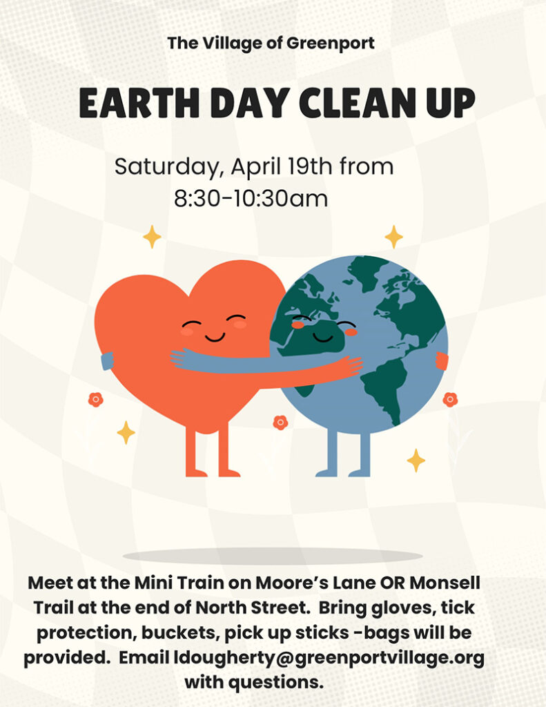 The Village of Greenport is hosting a clean up Saturday, April 19, from 8:30 to 10:30 a.m. to help keep the village beautiful. Bring your own gloves, tick protection, buckets and pick-up sticks. Bags will be provided. Those interested should meet at the miniature train on Moore’s Lane, or at Monsell Trail at the end of North Street.