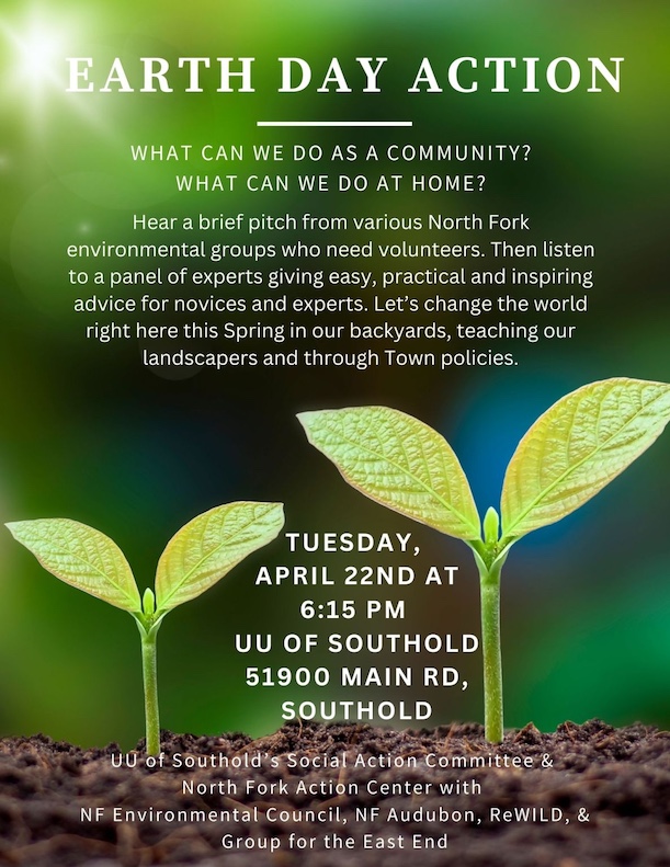 North Fork environmental groups will gather at the Unitarian Universalists of Southold Meeting Hall (51900 Main Road) Tuesday, April 22, at 6:15 p.m. to provide information regarding exciting volunteer opportunities. Following these short presentations, president of the North Fork Environmental Council Mark Haubner will moderate an open panel of local experts, which will discuss practical and inspiring environmental advice to change the world one step at a time.