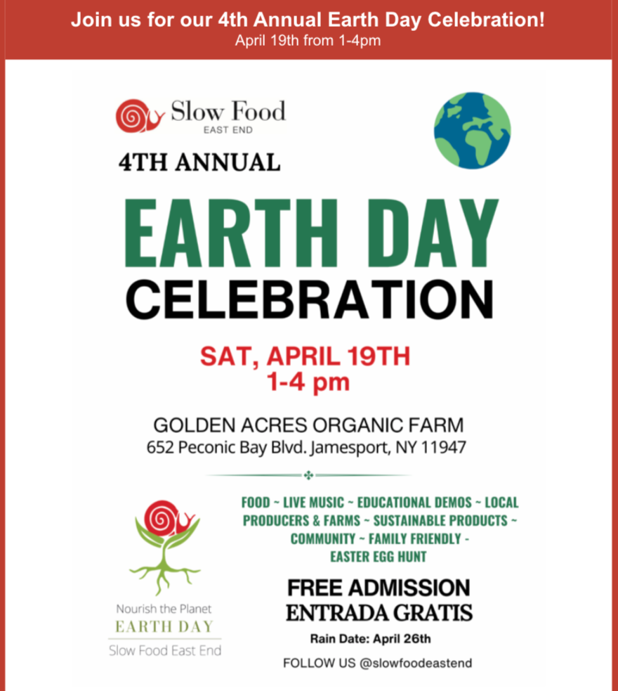 Slow Food East End and Golden Acres Farm (652 Peconic Bay Blvd., Jamesport) are holding an all-day Earth Day celebration on Saturday, April 19, packed with local vendors, eco-activists, artists, farmers and food producers. Kids crafts, face-painting, an eco-friendly egg hunt and live demos will round out the afternoon’s festivities.