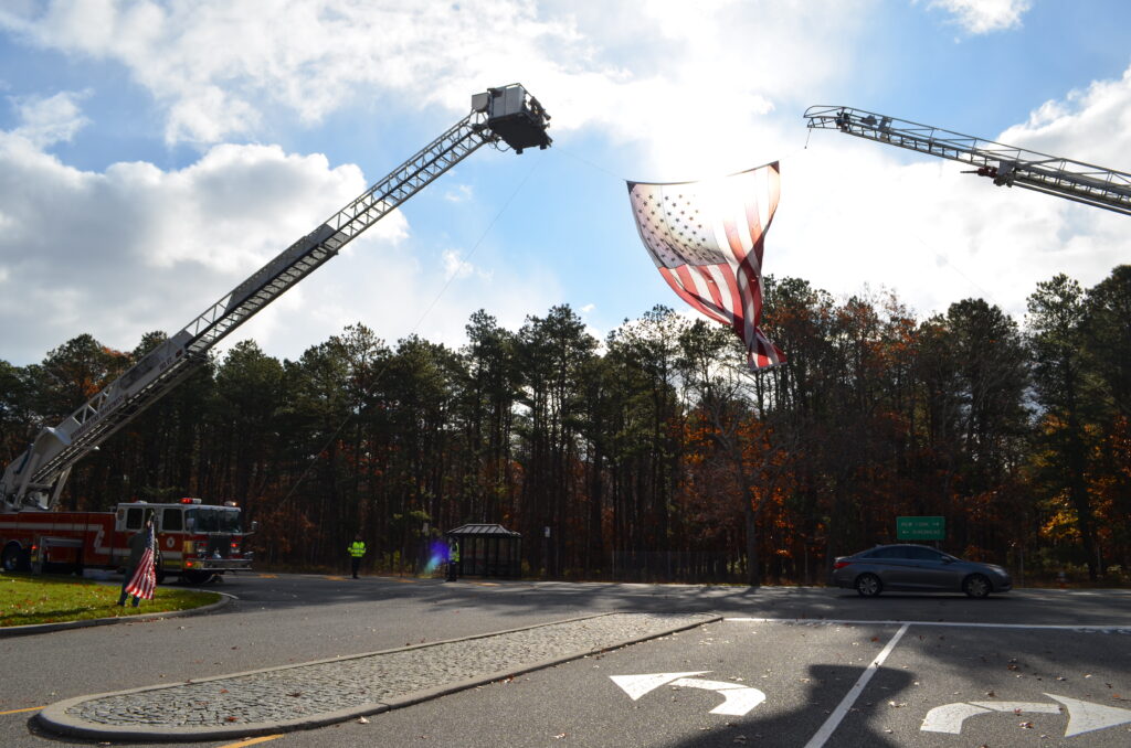 The Riverhead and Jamesport fire departments showed their support with their ladder trucks and draped a large American flag over the cemetery entrance. First responders dressed in their highest uniforms, and Riverhead police vehicles flashed their lights along the roadway. Those who attended waved their own American flags.