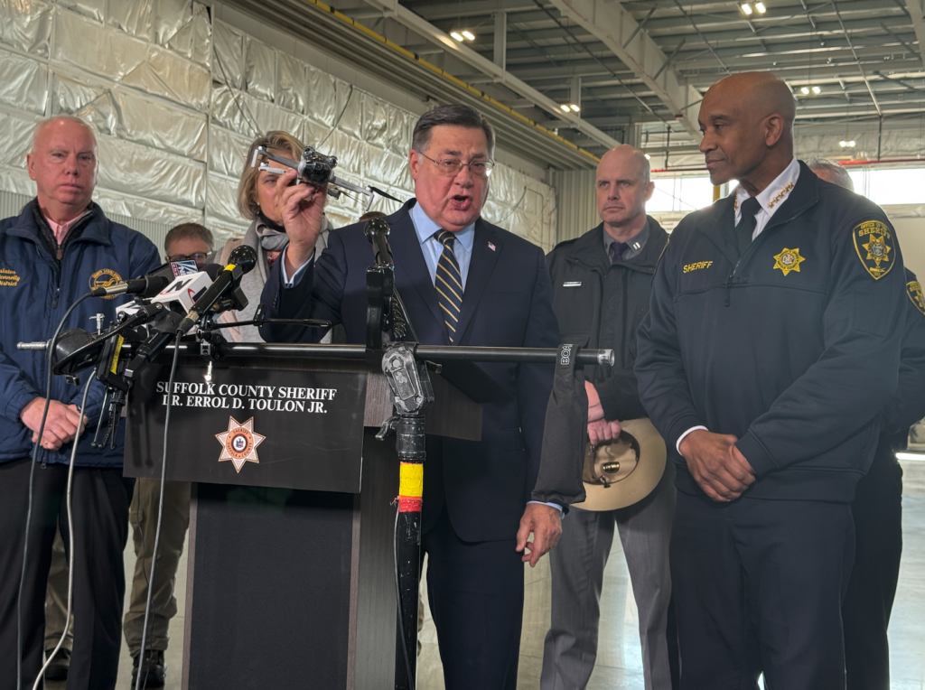Uniformed police officers and men in suits flank the Suffolk County Sheriff, who is speaking at a podium.