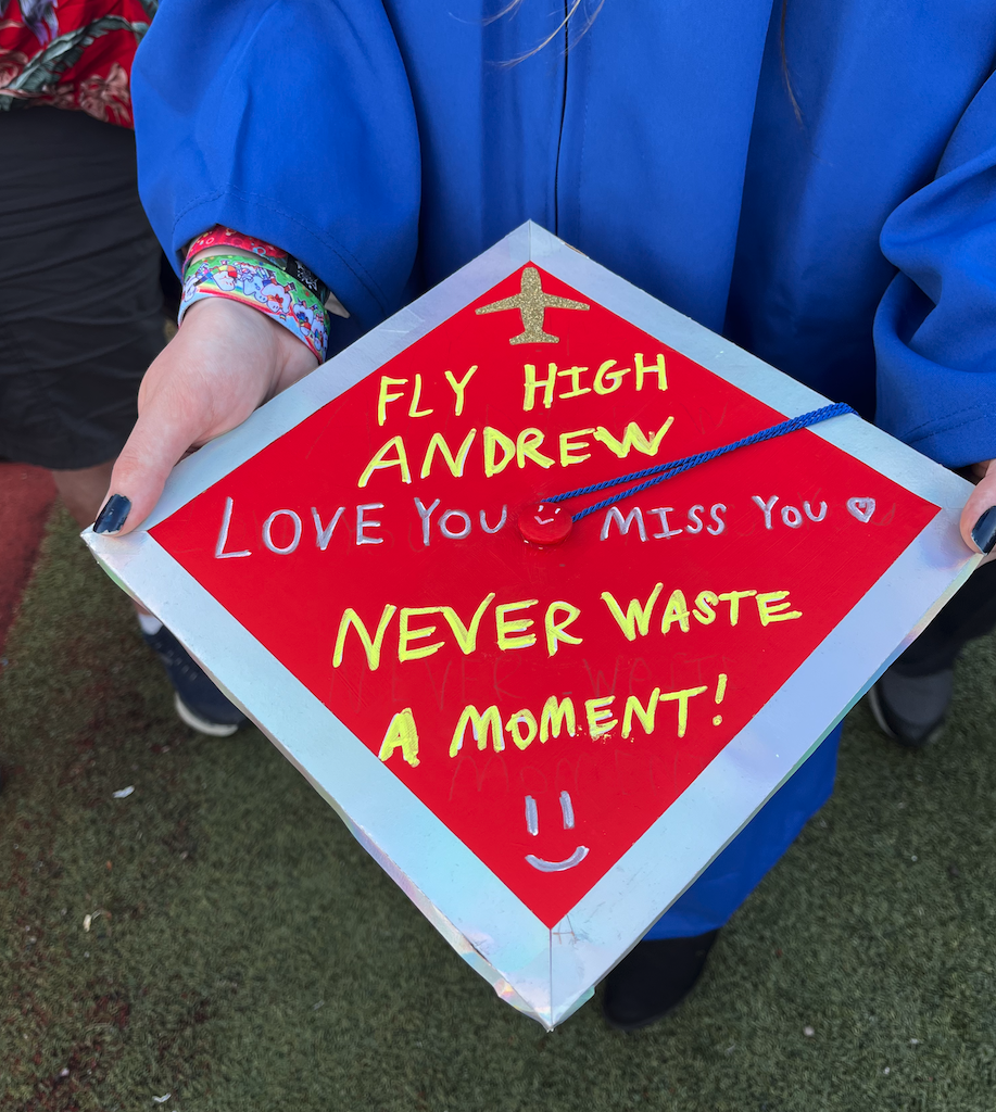 “My husband’s holding Andrew’s [graduation] cap with a [memorial] pin,” she said. “I’m holding his picture and my daughter’s going up with one free hand so she can grab his diploma.
